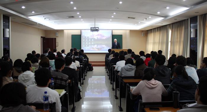 随后,基督城市长帕克先生在院103教室为2012级本科生们做了近一个小时的精彩演讲。帕克先生演讲语言朴实易懂,台风轻松自如。他三个方面描述了新西兰的基督城:第一,基督城有着上千年厚重的历史,在这里有古代和现代的碰撞;第二,他回忆了儿时的个人生活,从过去到现在,基督城都是个宁静、祥和的地方,非常适宜人们居住,同时,附近也有许多休闲的地方,新西兰的阿尔卑斯山脉就是旅游的极佳去处,人们可以在旅游景区滑雪、赏景;第三,与7日福格斯教授一样,帕克先生也称赞了当地优秀的教育,非常鼓励大家去基督城的大学深造。不得不提的是,演讲结束后的提问环节,当被问及为什么选择武汉这座城市进行交流时,帕克先生非常从容地回答了三个原因,一是因为100年前新西兰一位伟大的人物为中新交流做了很大贡献,二是因为他与华中大williamhill中文的学者一直有着密切的往来,三是因为交流项目能给中新两方年轻人提供更多的机会。